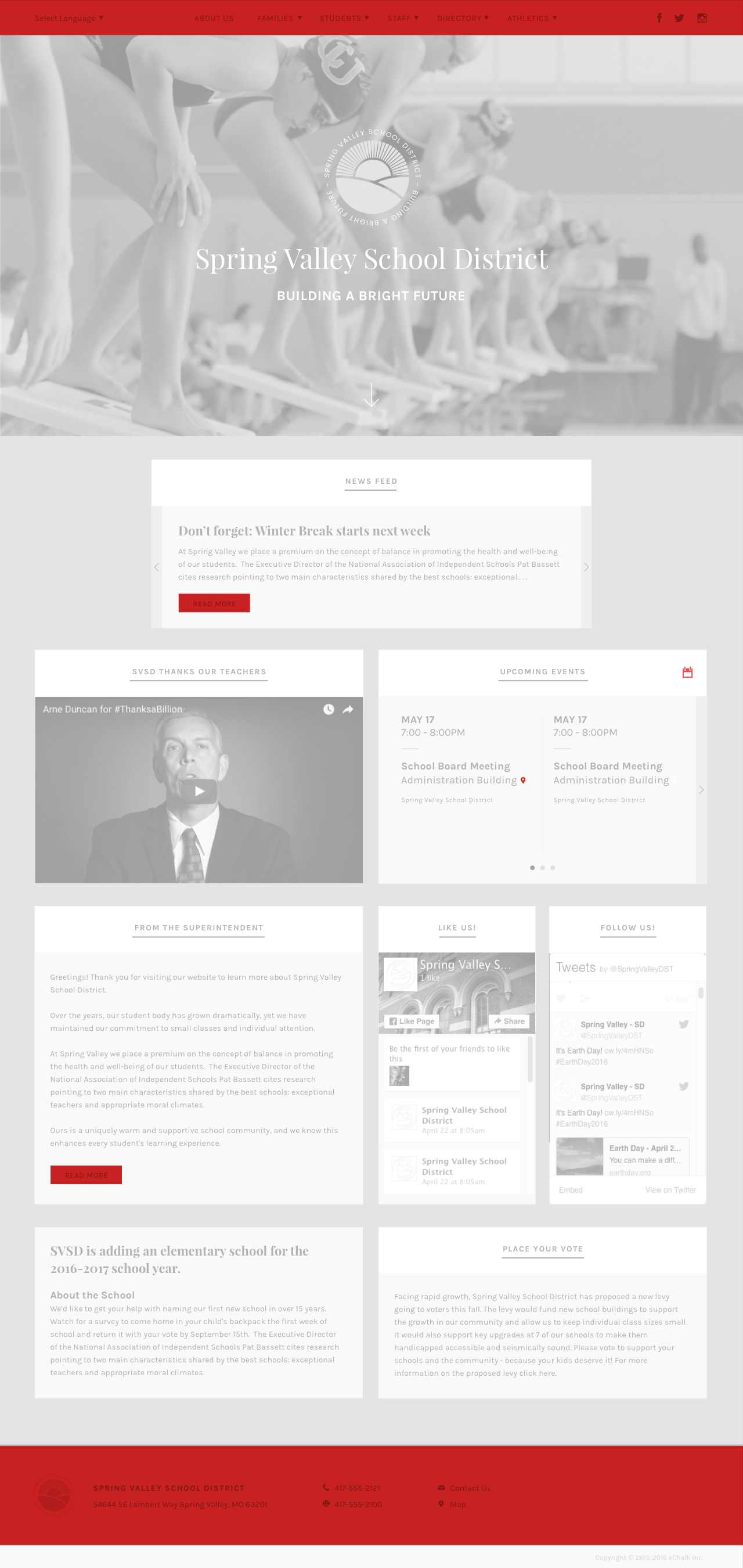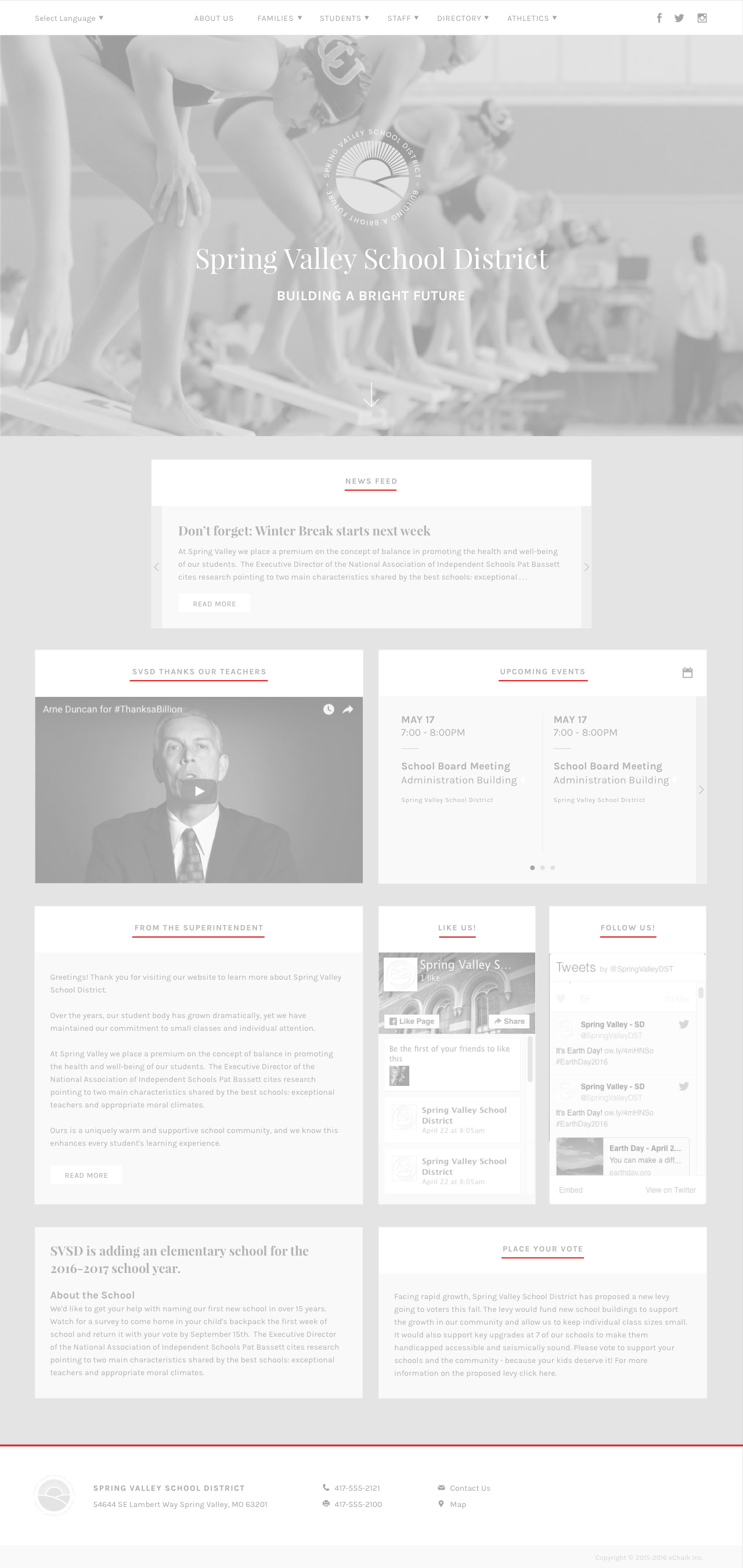 The Reprise Theme is for the district or school that relies on the public site to get daily information out to the community in a graphic heavy format that is easier to digest. It is an enhanced version of the Brochure theme. The Header and Footer Link Lists for your social media icons are featured in the upper right and lower right corners of the page. The background header images don't overwhelm the background of the entire page. The logo is also featured again in the footer. Like all eChalk themes, it is fully responsive and compatible with all devices.